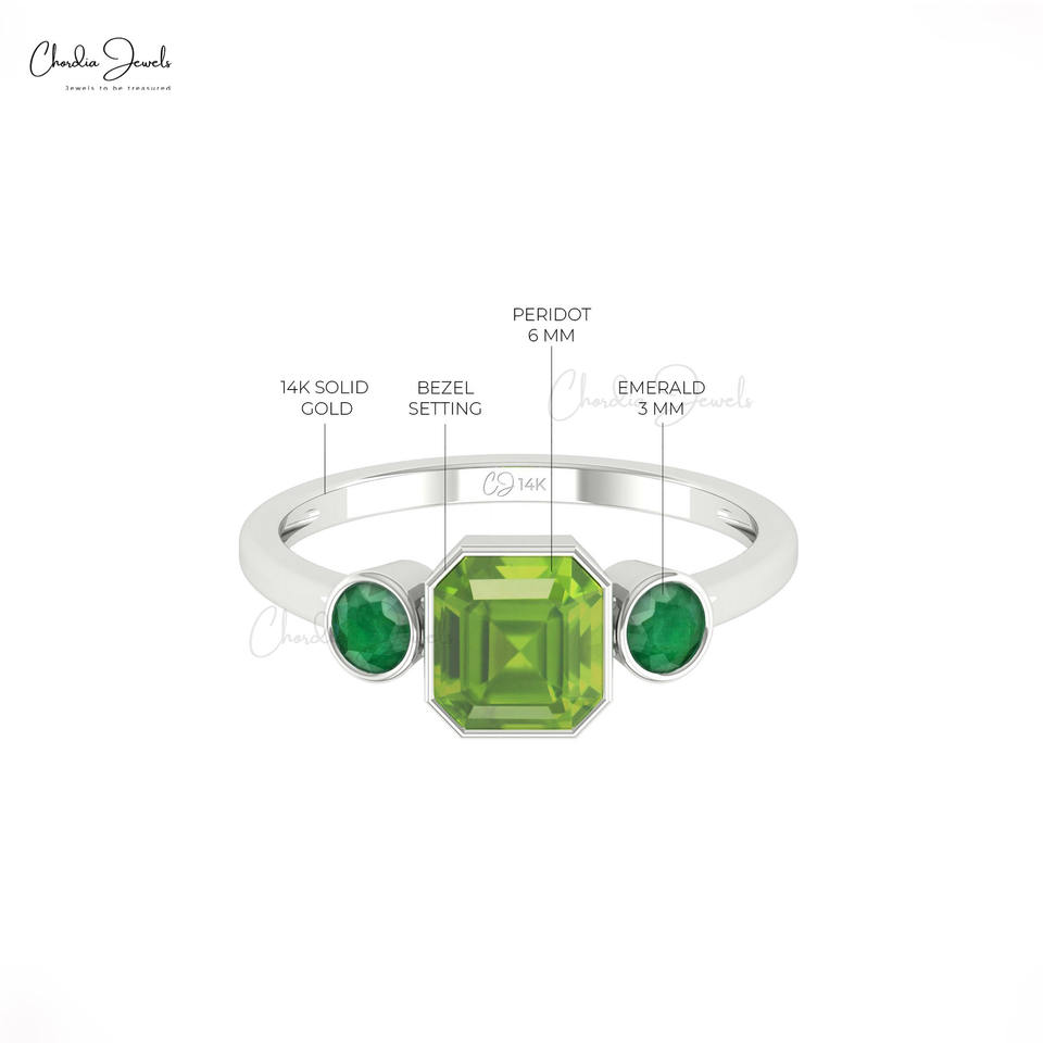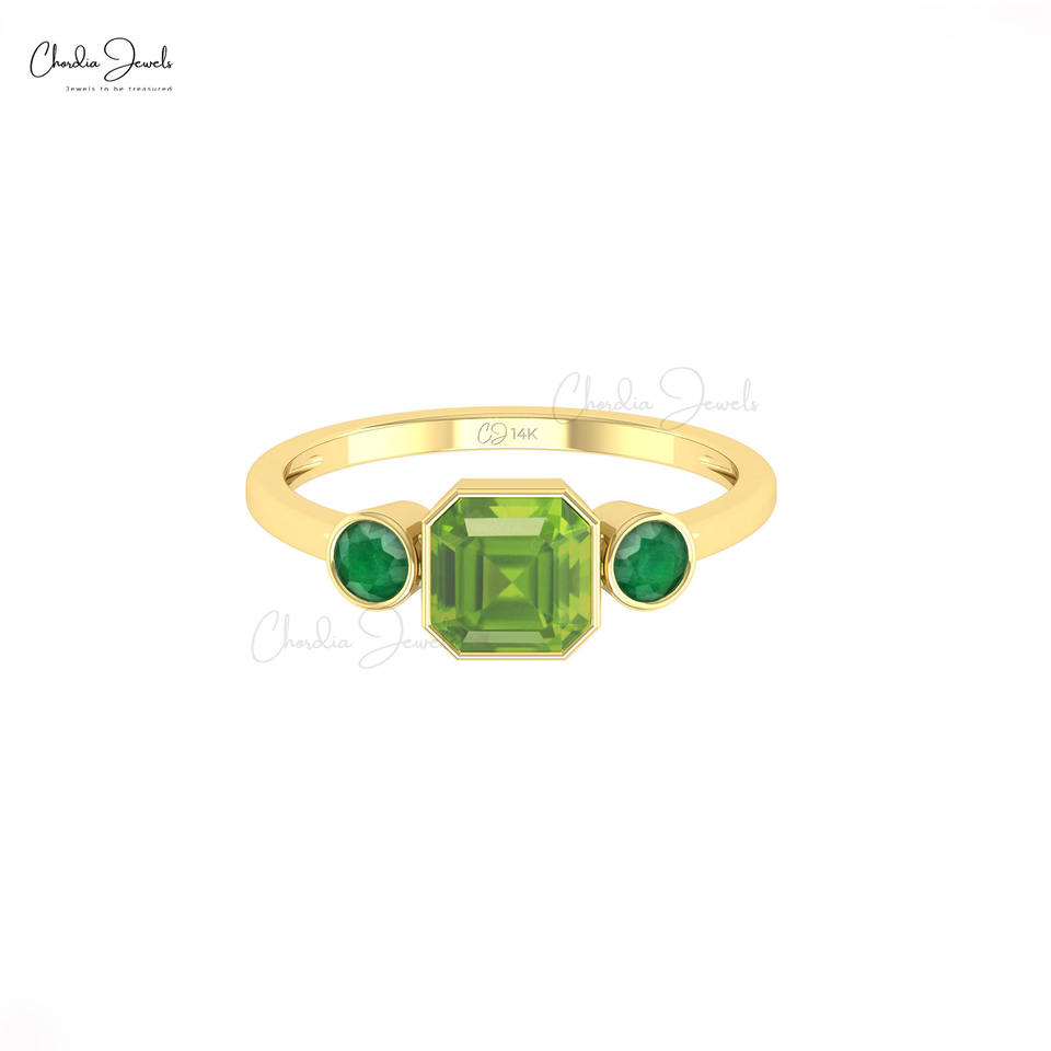 แหวนแต่งงานทองคำแท้ 14K คุณภาพสูง ประดับเพอริดอตสามเม็ด รูปทรงสี่เหลี่ยมแปดเหลี่ยม น้ำหนักรวม 1.97 กะรัต ปราศจากนิกเกิลและสารตะกั่ว 100%