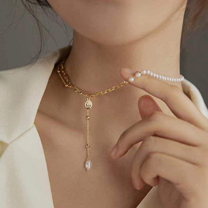 สร้อยคอโชคเกอร์หรูหราสำหรับผู้หญิง ไข่มุกน้ำจืดธรรมชาติ ดีไซน์ประดับเม็ดมุกบางเบา สร้อยคอแบบซ้อนชั้น ดีไซน์โชว์กระดูกไหปลาร้า แฟชั่นระดับไฮเอนด์