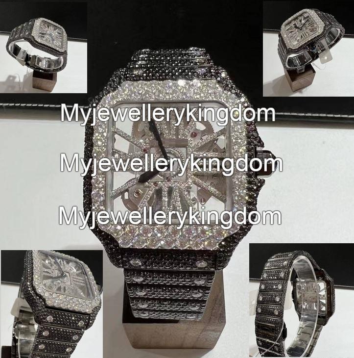 นาฬิกาข้อมือผู้ชายสีขาวทองหรูหรา ประดับเพชรโมอิสซาไนต์ VVS สีดำ กระจกแซฟไฟร์ กันน้ำ 10BAR ตัวเรือนสแตนเลสสตีล