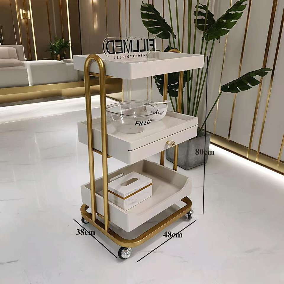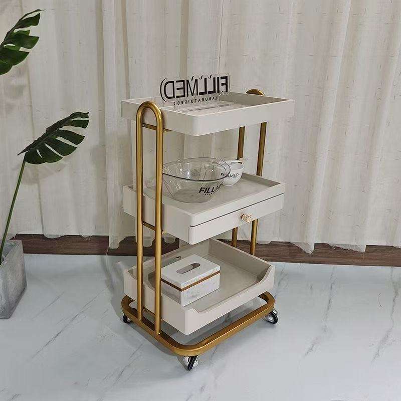 รถเข็นหรูหราคุณภาพสูงสำหรับร้านเสริมสวยดูแลผิว พร้อมชั้นวางของไม้ รถเข็นอุปกรณ์โลหะและพลาสติก