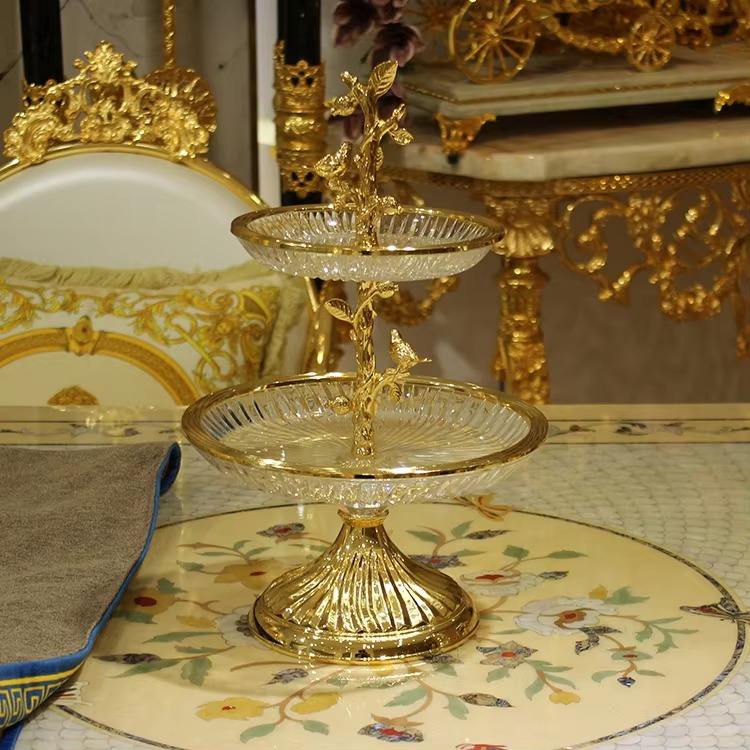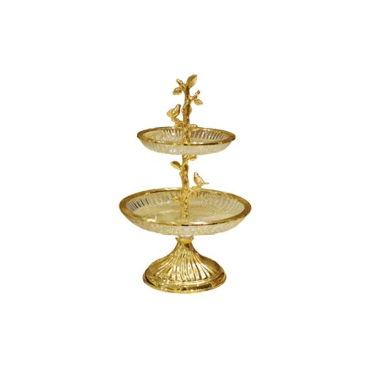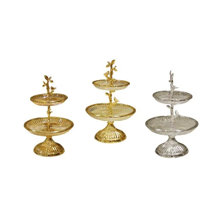 ถาดตกแต่งงานแต่งงานสามชั้นคุณภาพสูงถาดผลไม้ทำจากแก้วผสมทองสำหรับตกแต่งบ้าน
