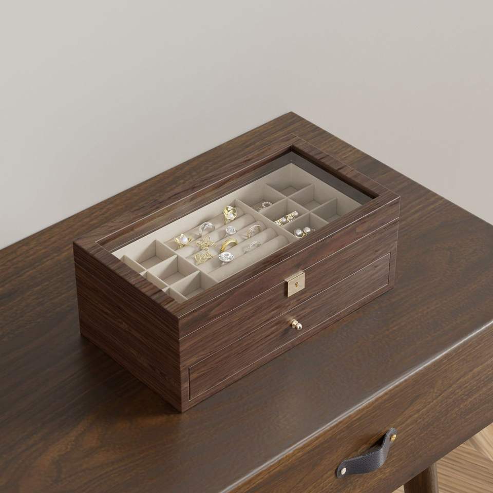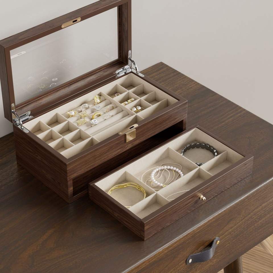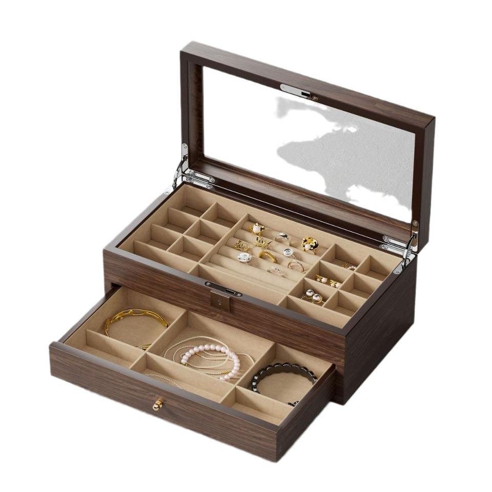 กล่องลิ้นชักไม้สองชั้นทรงสี่เหลี่ยมผืนผ้าไฮเอนด์พร้อมความจุขนาดใหญ่โซลูชันการจัดเก็บที่เป็นมิตรกับสิ่งแวดล้อมสำหรับเครื่องประดับสวารอฟสกี้