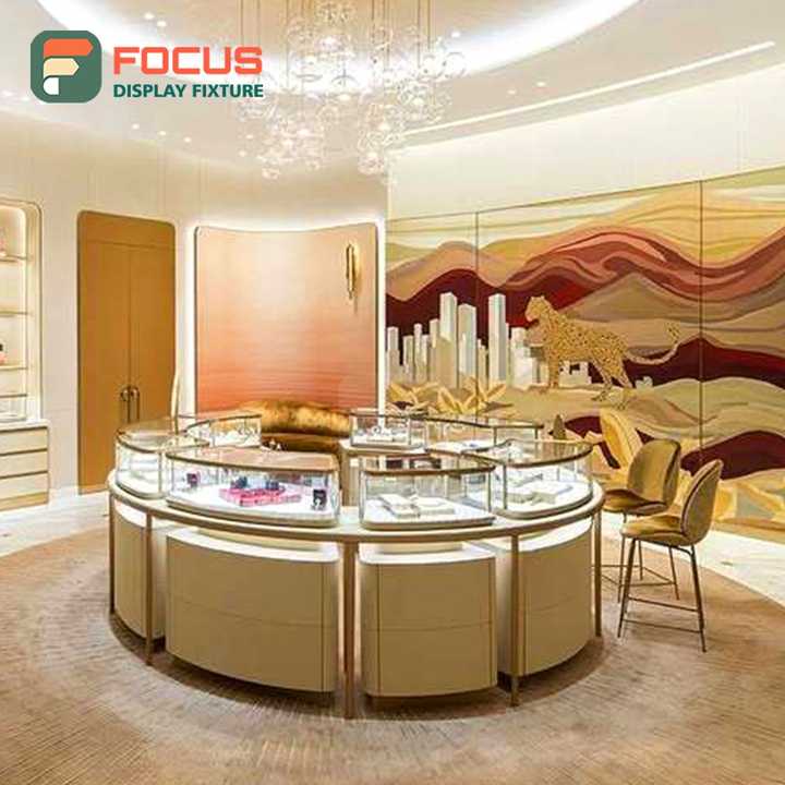 ตู้โชว์เครื่องประดับระดับไฮเอนด์ โมเดิร์น ทำจากไม้และกระจก พร้อมไฟ LED โครงโลหะ สำหรับร้านบูติก จัดแสดงภายในร้าน