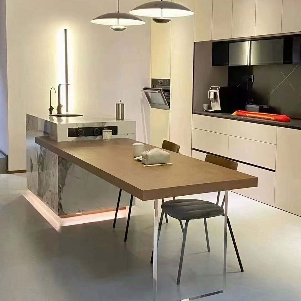High End Solid Wood Modern Dining Table with Integrated Island and Retractable Kitchen Bar-Customizable Durable Waterproof