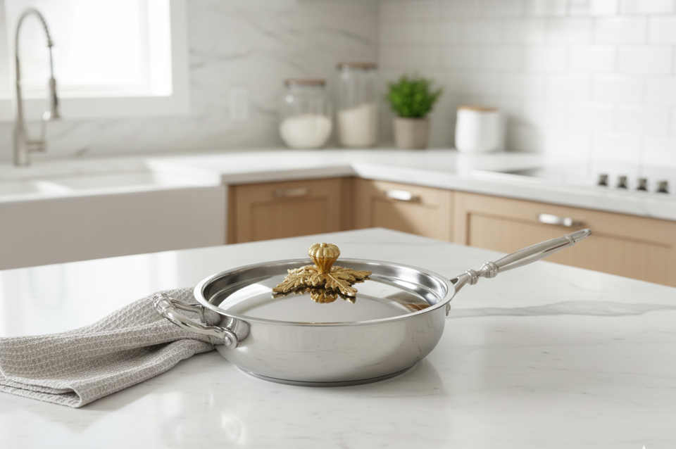 ชุดหม้อและกระทะสแตนเลสคุณภาพสูง พร้อมฝาปิดสีทองลายประณีต ชุดหม้อตุ๋น