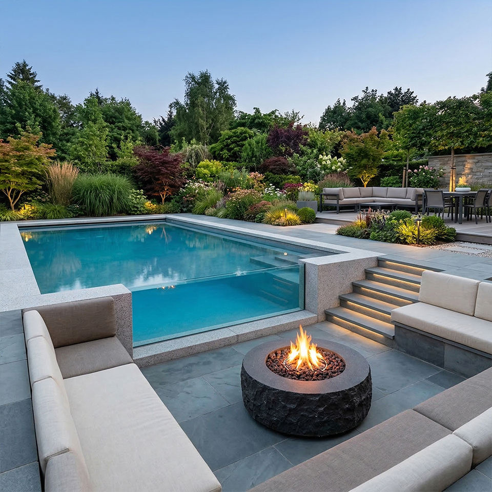 สระว่ายน้ำระดับไฮเอนด์พร้อมน้ำพุตกแต่งสวน ติดตั้งขอบกระเบื้องแบบกำหนดเอง