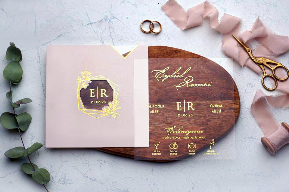 การ์ดเชิญงานแต่งงานอะคริลิกใสระดับไฮเอนด์ พร้อมปั๊มทองและเคลือบยูวี ออกแบบฟรีสำหรับรูปทรงที่ไม่ได้มาตรฐาน