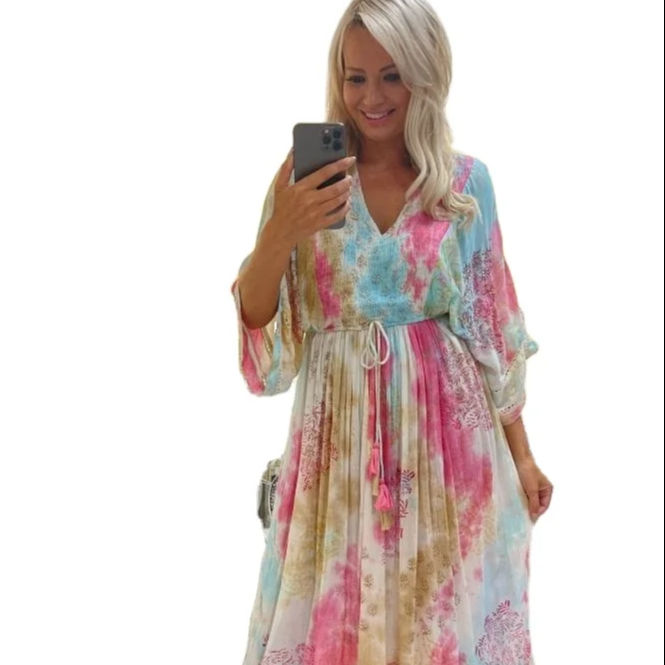 เดรสแม็กซี่ยาวแบบลำลองของผู้หญิงแขนสามส่วนมัดย้อมงานแฮนด์เมดแฟชั่นชั้นสูง
