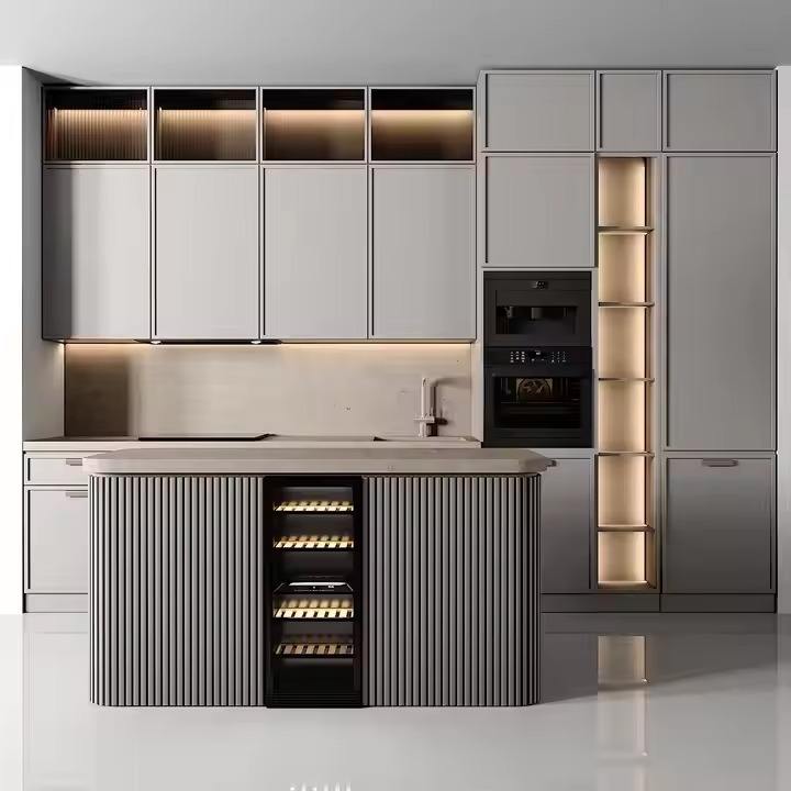 ชุดตู้กับข้าวไม้จริงตู้ครัวดีไซน์ทันสมัยทำจากพีวีซีสีขาวมันวาว