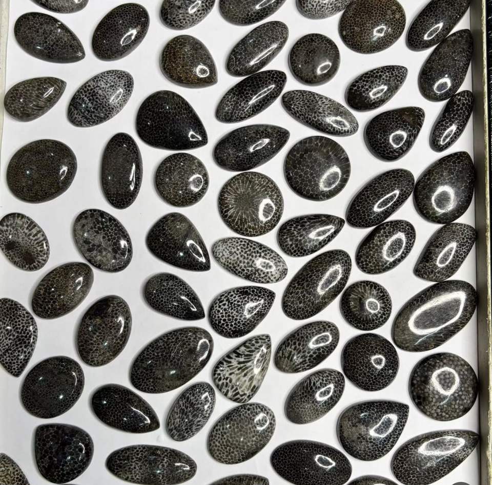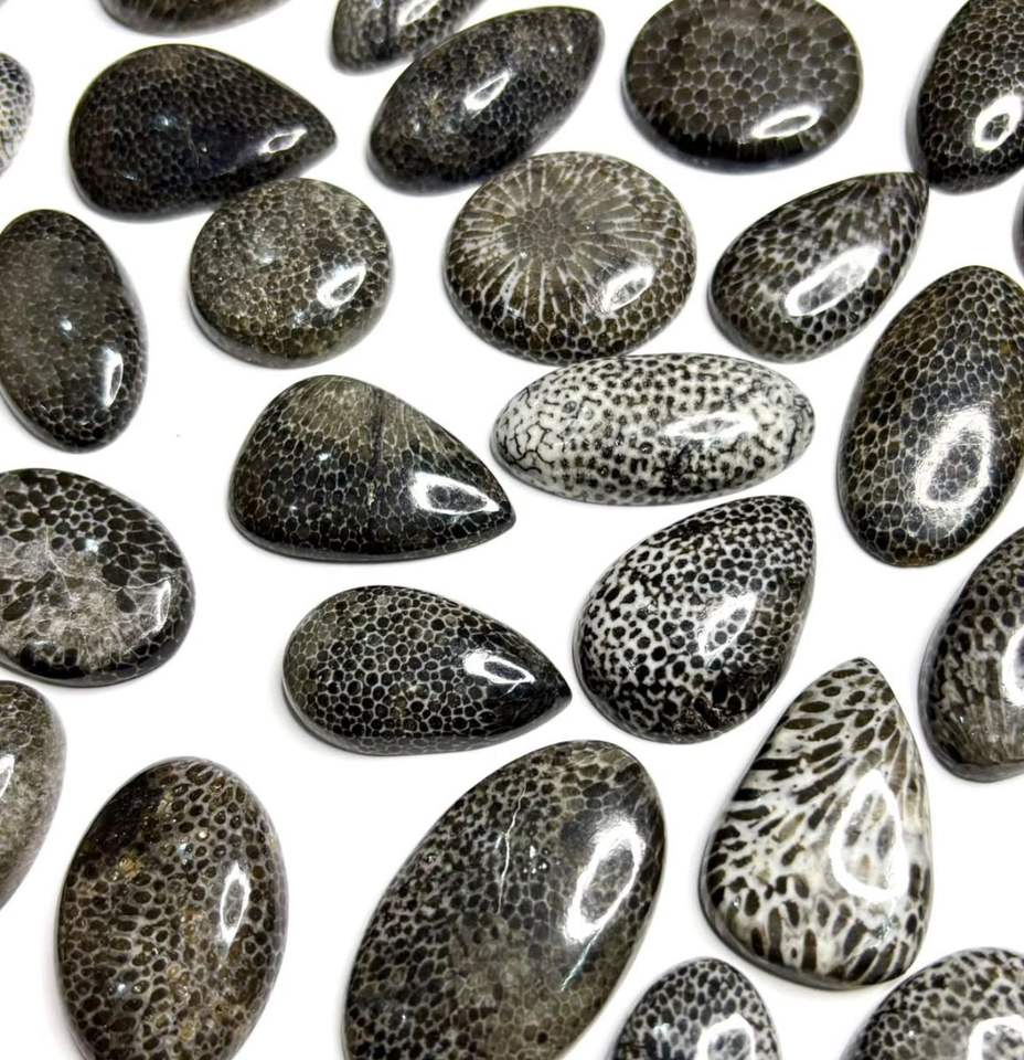 หินอัญมณีหลวมปะการังฟอสซิลสีดำธรรมชาติ100% เกรดสูงสำหรับตกแต่งเครื่องประดับทำด้วยมือ