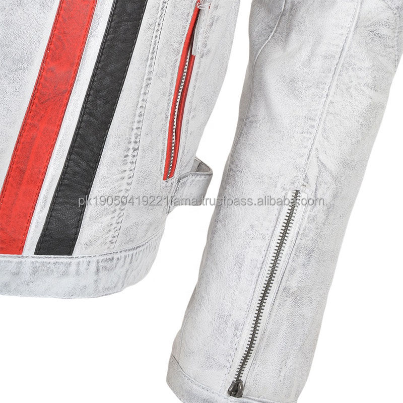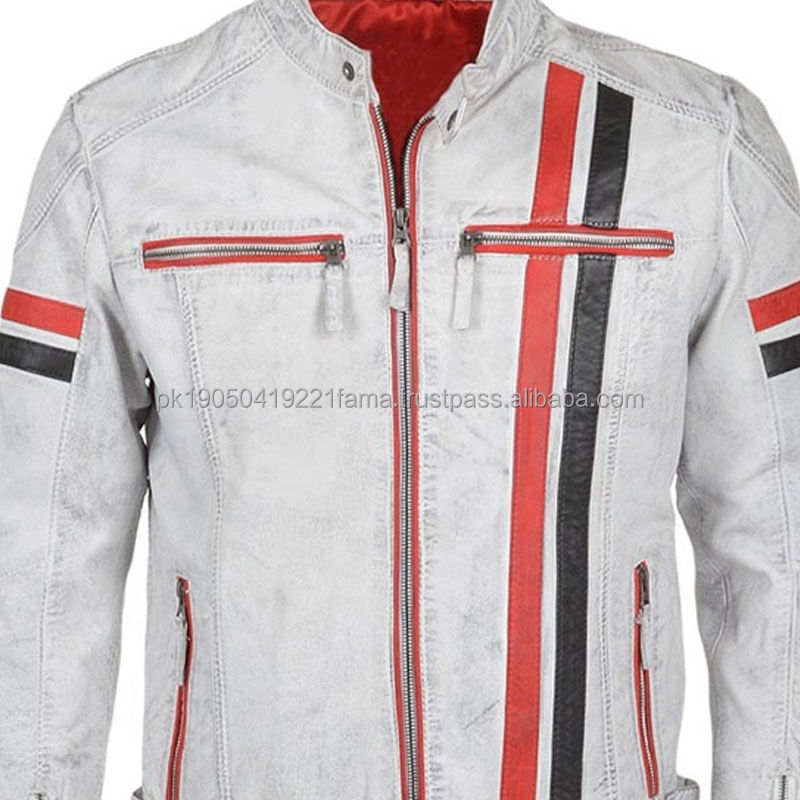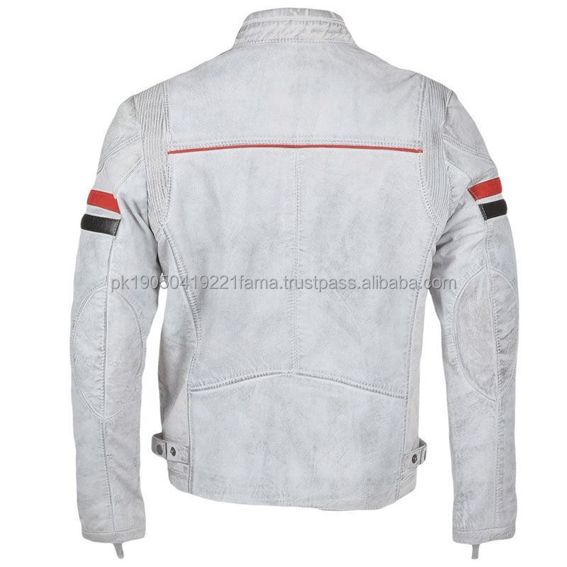 เสื้อแจ็กเก็ตหนังวัวแท้สำหรับผู้ชายเสื้อโค้ทลายทางด้านหน้าและแขนเสื้อแจ็คเก็ตเคลือบแว็กซ์สีขาวสำหรับนักขี่มอเตอร์ไซค์