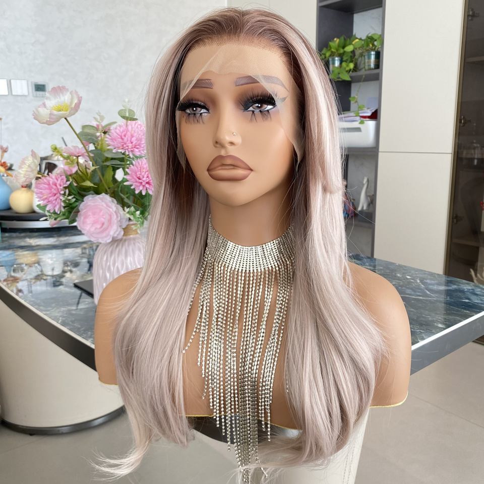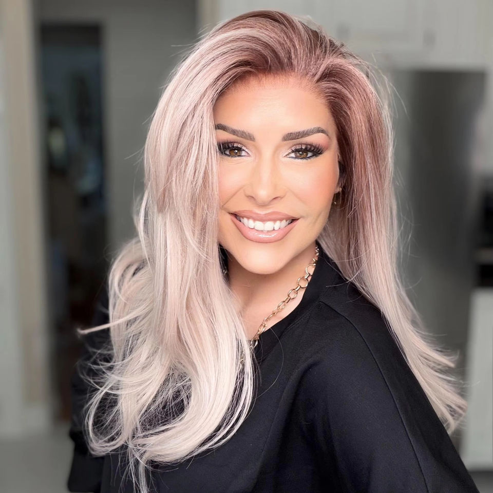 วิกผมหน้าผากลูกไม้สีบลอนด์แอปริคอทพีชชมพูแบบนุ่มเป็นชั้นๆ คุณภาพสูง ทำจากเส้นใยทนความร้อนสูง สำหรับคนศีรษะขนาดเล็ก