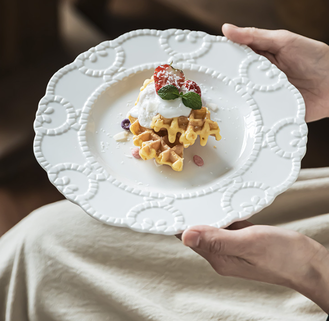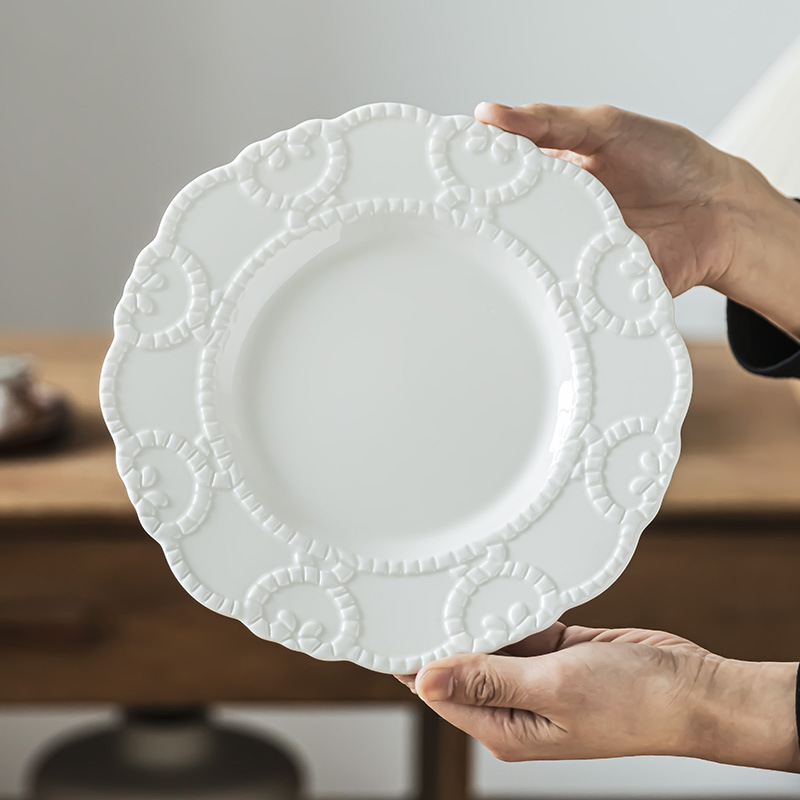 จานเซรามิกลายนูนสีขาวเกรดสูงสไตล์ราชวงศ์ฝรั่งเศสสำหรับตกแต่งโต๊ะงานแต่งงานน้ำชายามบ่ายและใช้รับประทานอาหารที่บ้าน