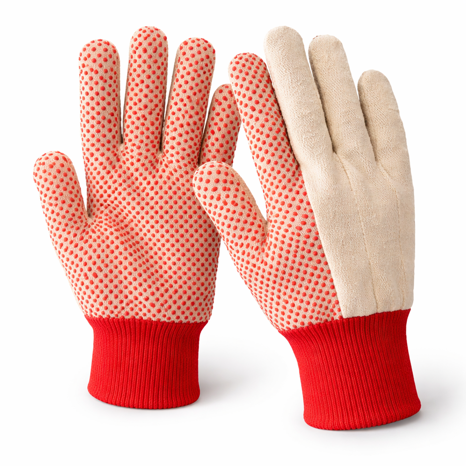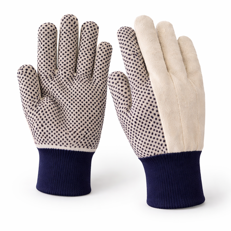 ถุงมือผ้าแคนวาสเย็บ 2-3 ชั้น เคลือบ PVC ลายจุด (สีดำ) ผลิตจากผ้าฝ้ายเวียดนาม ไม่ผสมซิลิโคน ไม่ผสมแป้ง น้ำหนัก 80 กรัม ยึดเกาะสูง