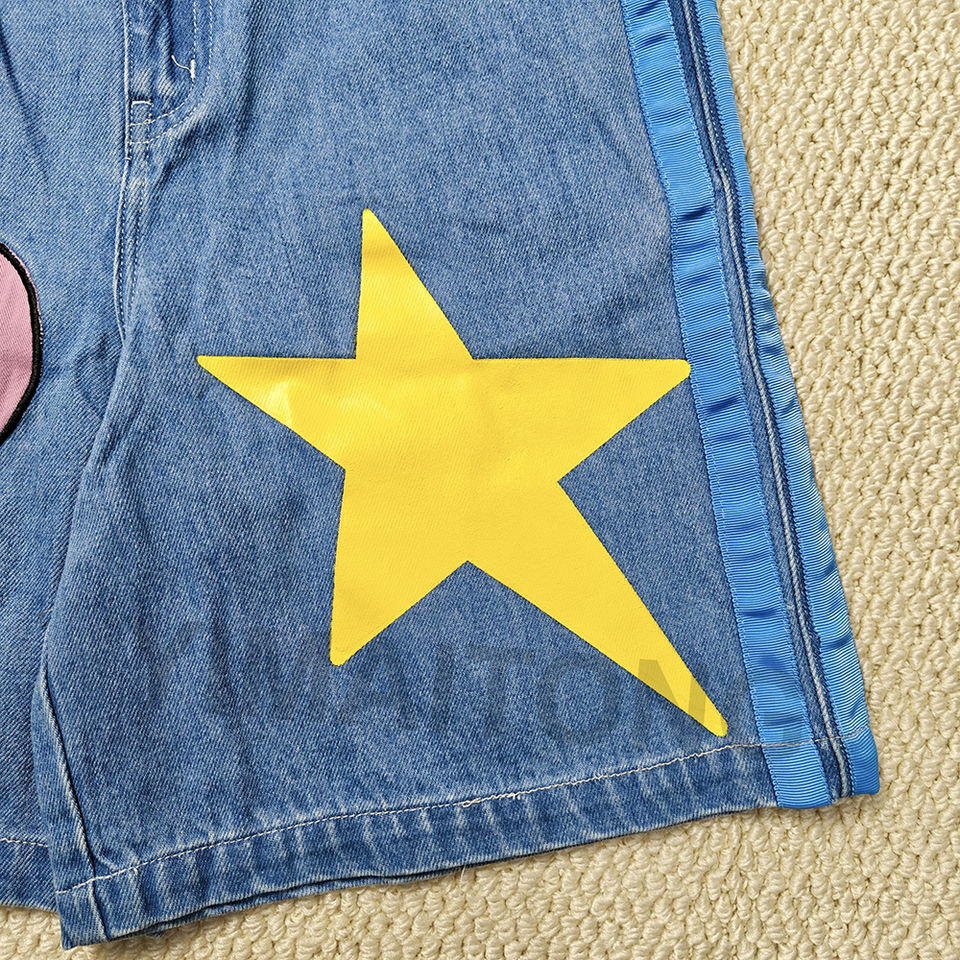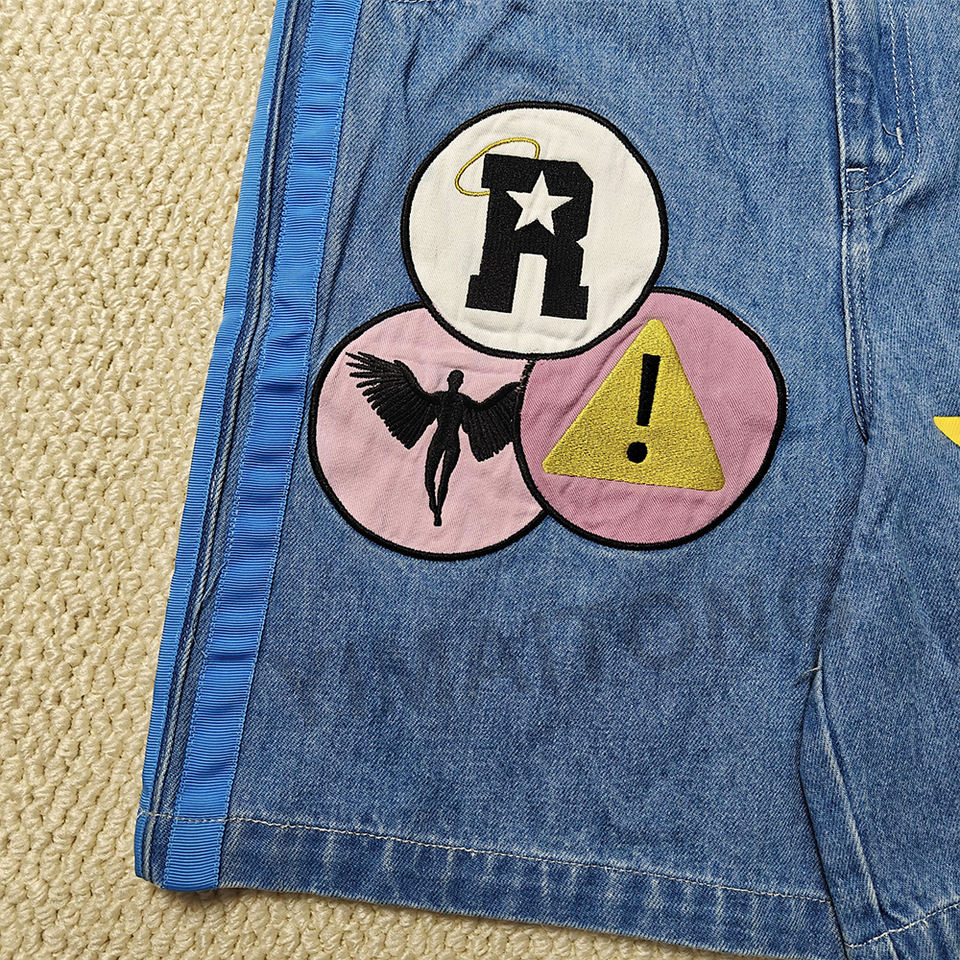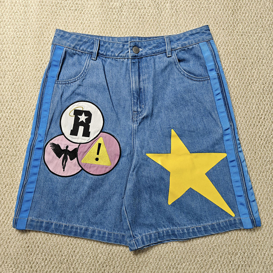กางเกงยีนส์ทรงแบ็กกี้สำหรับผู้ชายกางเกงขาสั้นผ้ายีนส์แนวสตรีทแบบเย็บปะติดสำหรับฤดูร้อน