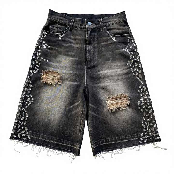 กางเกงยีนส์ขาสั้นทรงตรงสไตล์ Y2K ประดับด้วยคริสตัลคุณภาพสูง ดีไซน์ขาดๆ สำหรับผู้ชาย ทรงปกติ สวมใส่สบายๆ ในฤดูร้อน สไตล์สตรีทแวร์ ตกแต่งด้วยลูกปัด