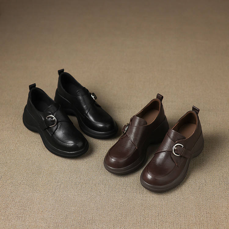 รองเท้าส้นสูงสไตล์เรโทร หนังแท้สีพื้น กันน้ำ กันลื่น ทนทาน พื้นนุ่ม ตัดเย็บอย่างดี สายรัดหนังเต็มตัวพร้อมหัวเข็มขัด