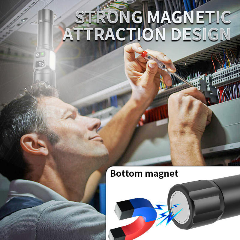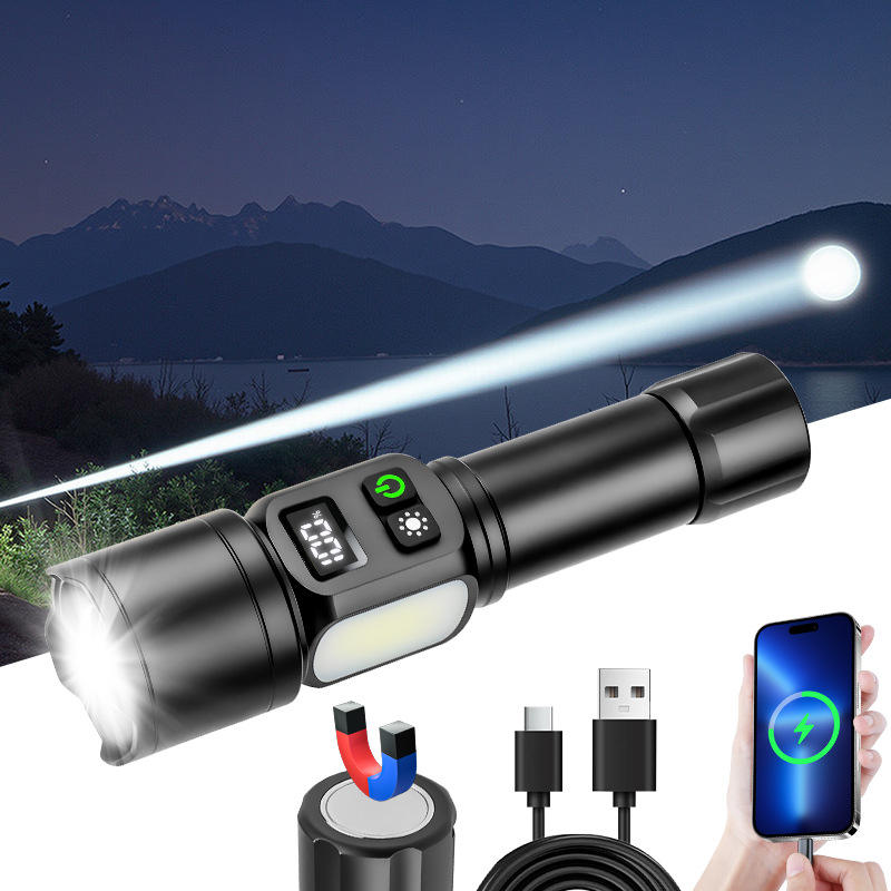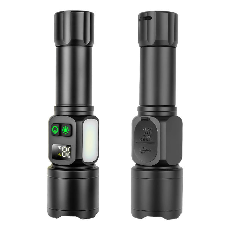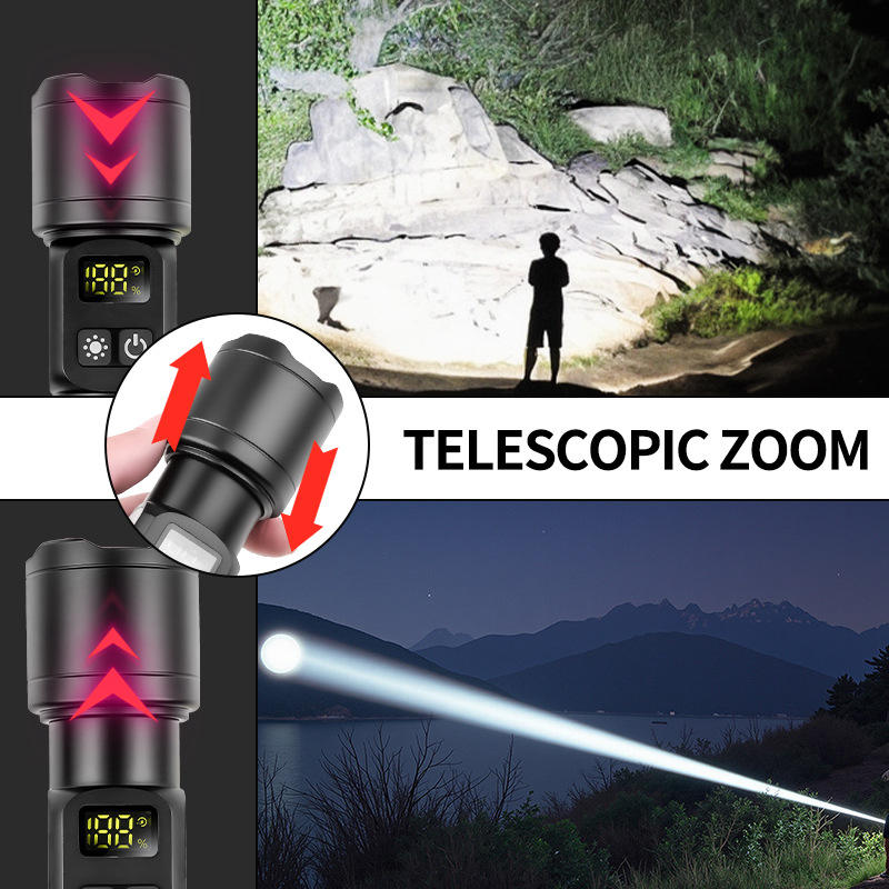 ไฟฉาย LED ความเข้มสูงพร้อมจอแสดงผลดิจิตอล ซูมแบบยืดหดได้ แบตเตอรี่แบบชาร์จไฟได้ แสงสีขาว ใช้กลางแจ้ง