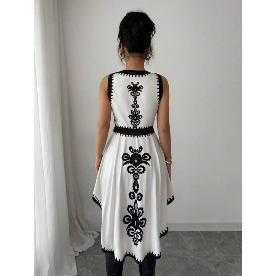 เสื้อทูนิคปักลายไฮโลว์ทรงเปปลัม แต่งขอบตัดกัน สไตล์คอนเทมโพรารี่ เอธนิค โบโฮชิค แขนกุด รัดเอว