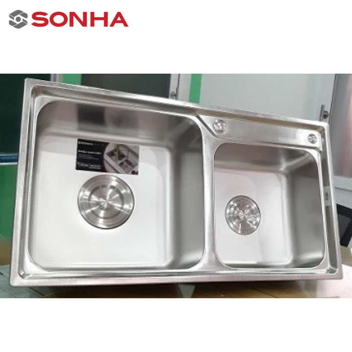 อ่างล้างจานครัวทรงสี่เหลี่ยมสองหลุม สแตนเลสเกรดพรีเมียม SS304 ผิวขัดเงา ขนาด 800x440x217 มม. ยี่ห้อ SONHA ผลิตในเวียดนาม