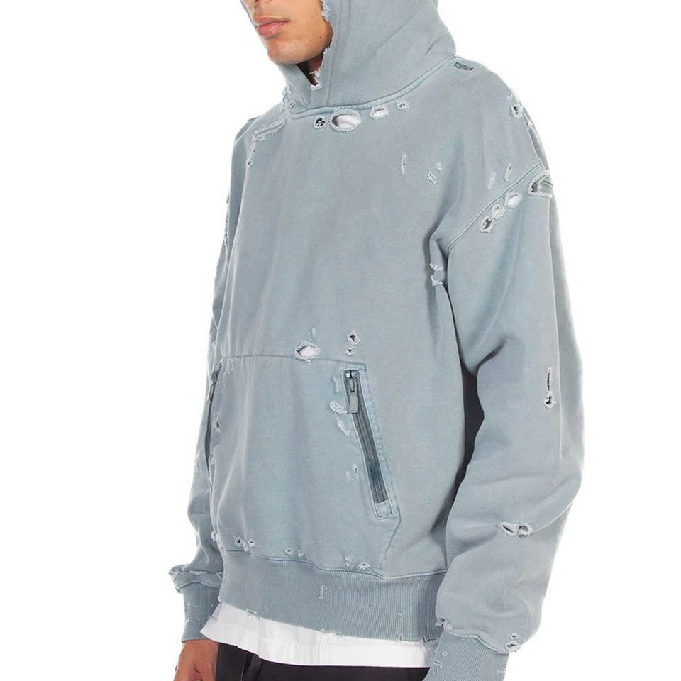 เสื้อฮู้ดดี้คอสูงทรงหลวม ผ้าฝ้ายฟลีซ 100% พิมพ์ลายดิจิทัลสำหรับฤดูหนาว แต่งดีเทลขาดๆ แบบดิสเทรส ทรงโอเวอร์ไซส์