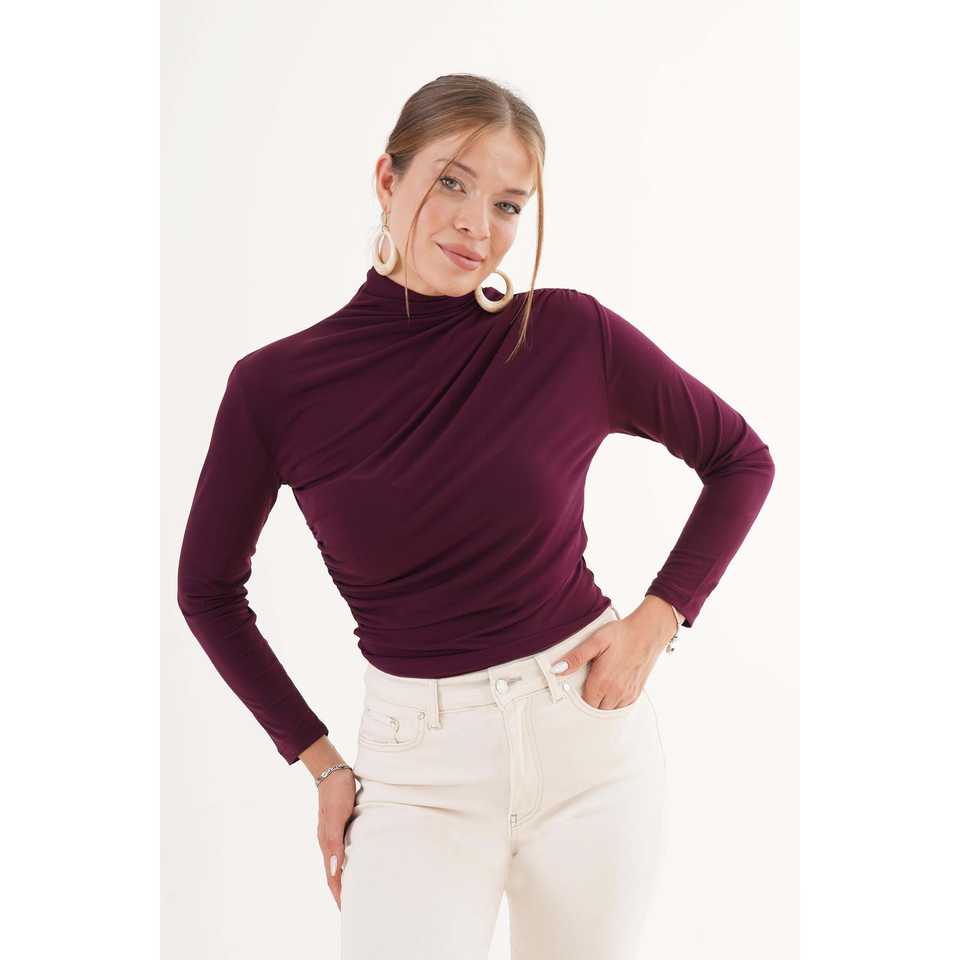 เสื้อคอสูงสีพลัม แต่งระบายที่ไหล่และเอว ผ้าถักลำลอง ขายส่ง