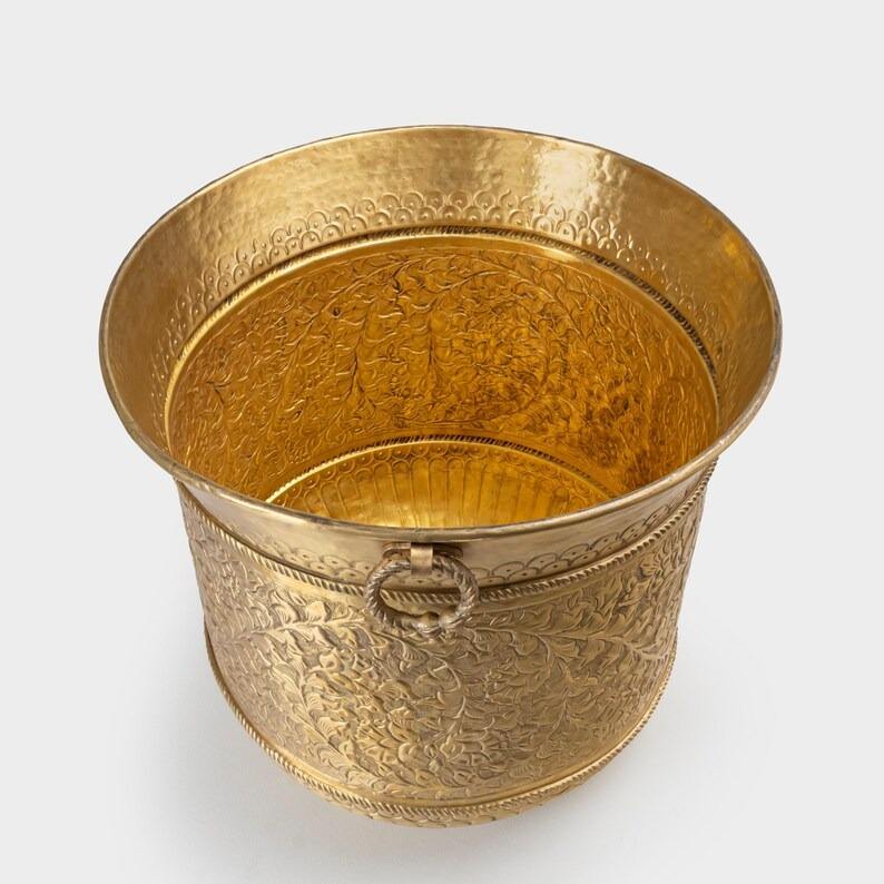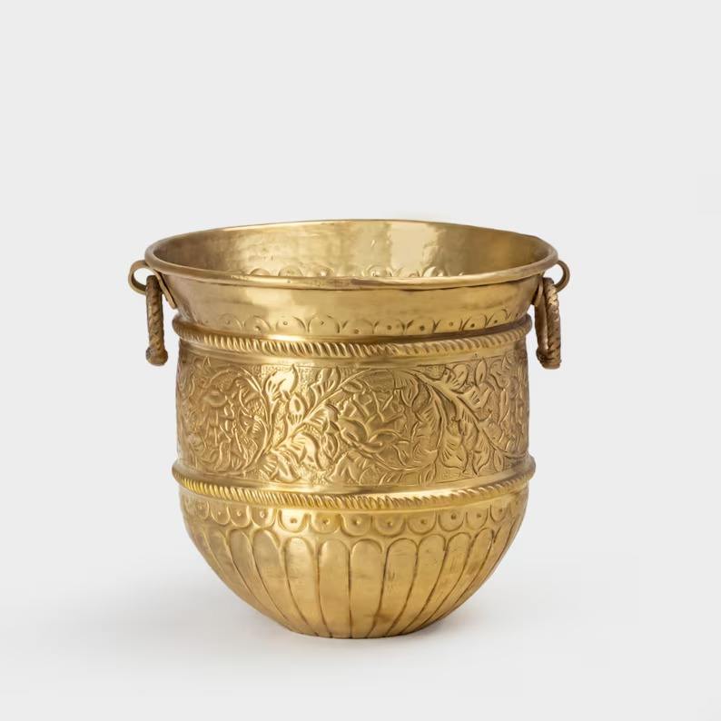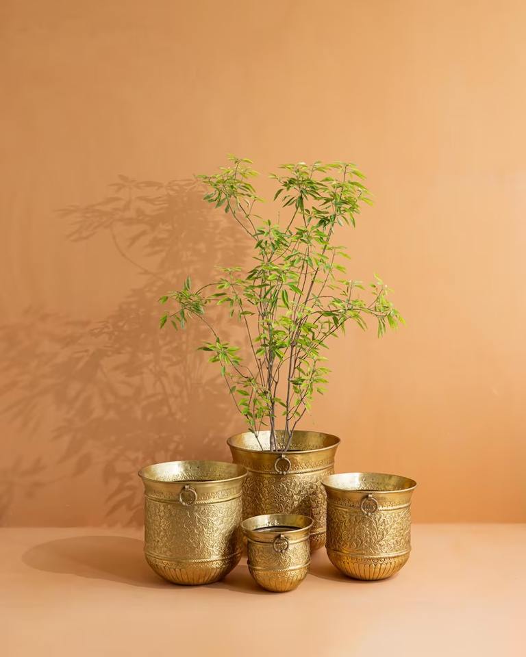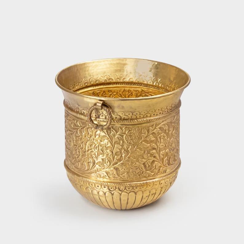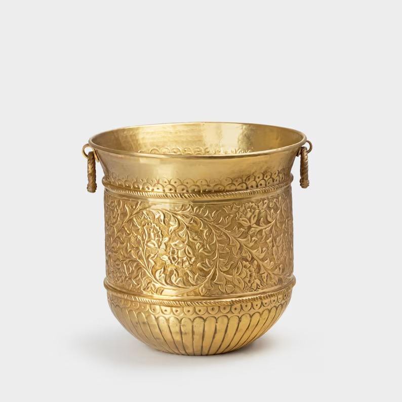 กระถางต้นไม้โลหะสีทองแบบมินิมอลพร้อมที่จับกระถางดอกไม้ในร่มและกลางแจ้ง
