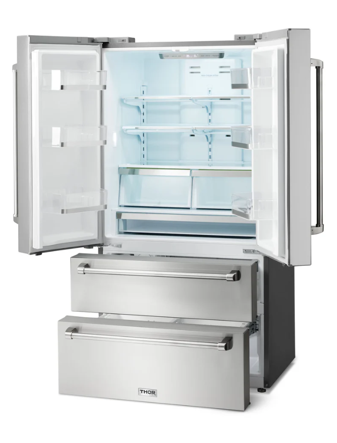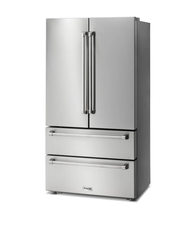 ประสิทธิภาพสูง ขนาด 36 นิ้ว 22.5 คิว ตู้เย็นแบบประตูฝรั่งเศสแบบตั้งอิสระพร้อมเครื่องทำน้ำแข็ง สแตนเลสสตีล