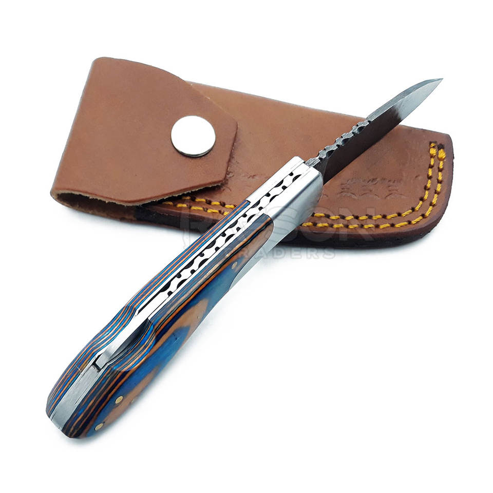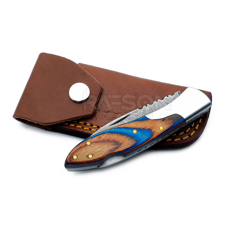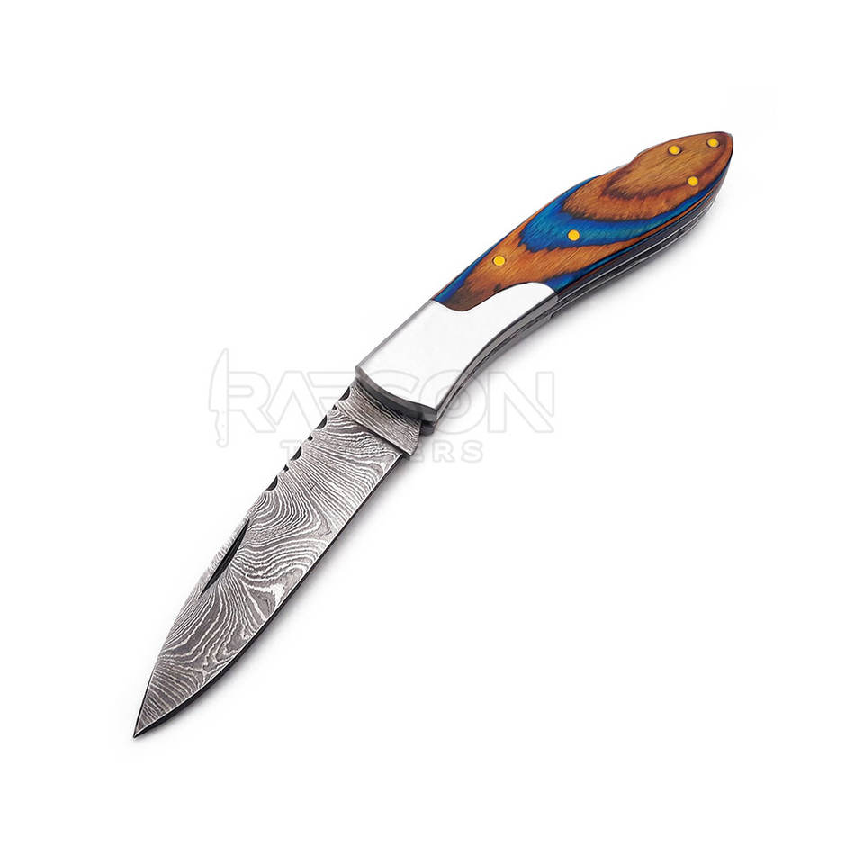 มีดพับได้ทำจากเหล็กดามัสกัสประสิทธิภาพสูงสำหรับล่าสัตว์มีดตัดแม่นยำทนทานปรับแต่งได้ตามต้องการ