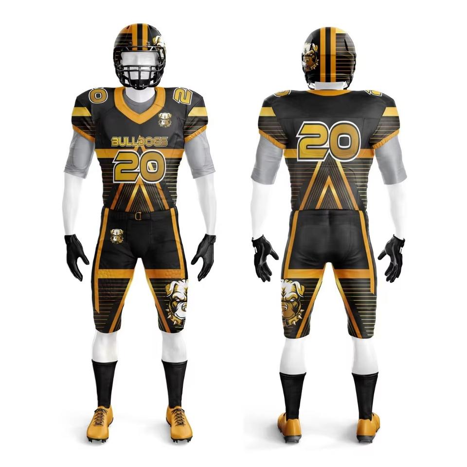 ชุดยูนิฟอร์มอเมริกันฟุตบอลสำหรับผู้ชายคุณภาพพรีเมียมประสิทธิภาพสูง พิมพ์ลายแบบซับลิเมชั่นตามสั่ง ระบายอากาศได้ดี ผ้าตาข่ายแบบรัดรูป