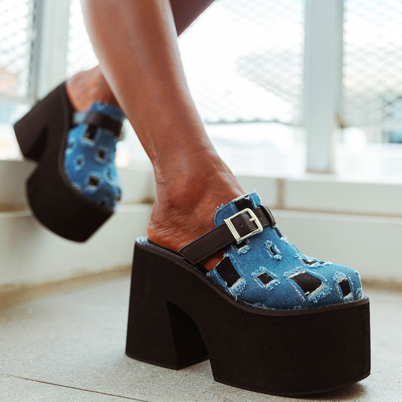 รองเท้าส้นตึกแบบแพทช์เวิร์คผ้าเดนิมสำหรับผู้หญิง สไตล์สไลด์สำหรับใส่กลางแจ้ง ส้นหนา หัวมน พร้อมสายรัดแบบหัวเข็มขัด