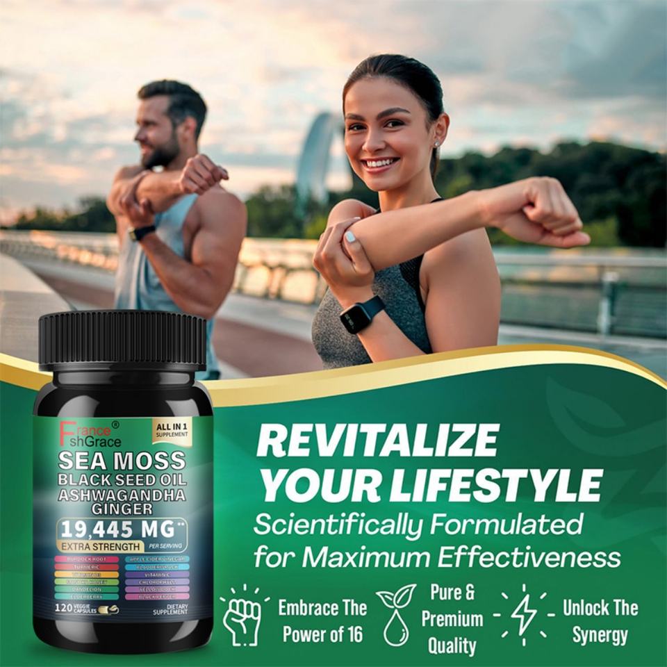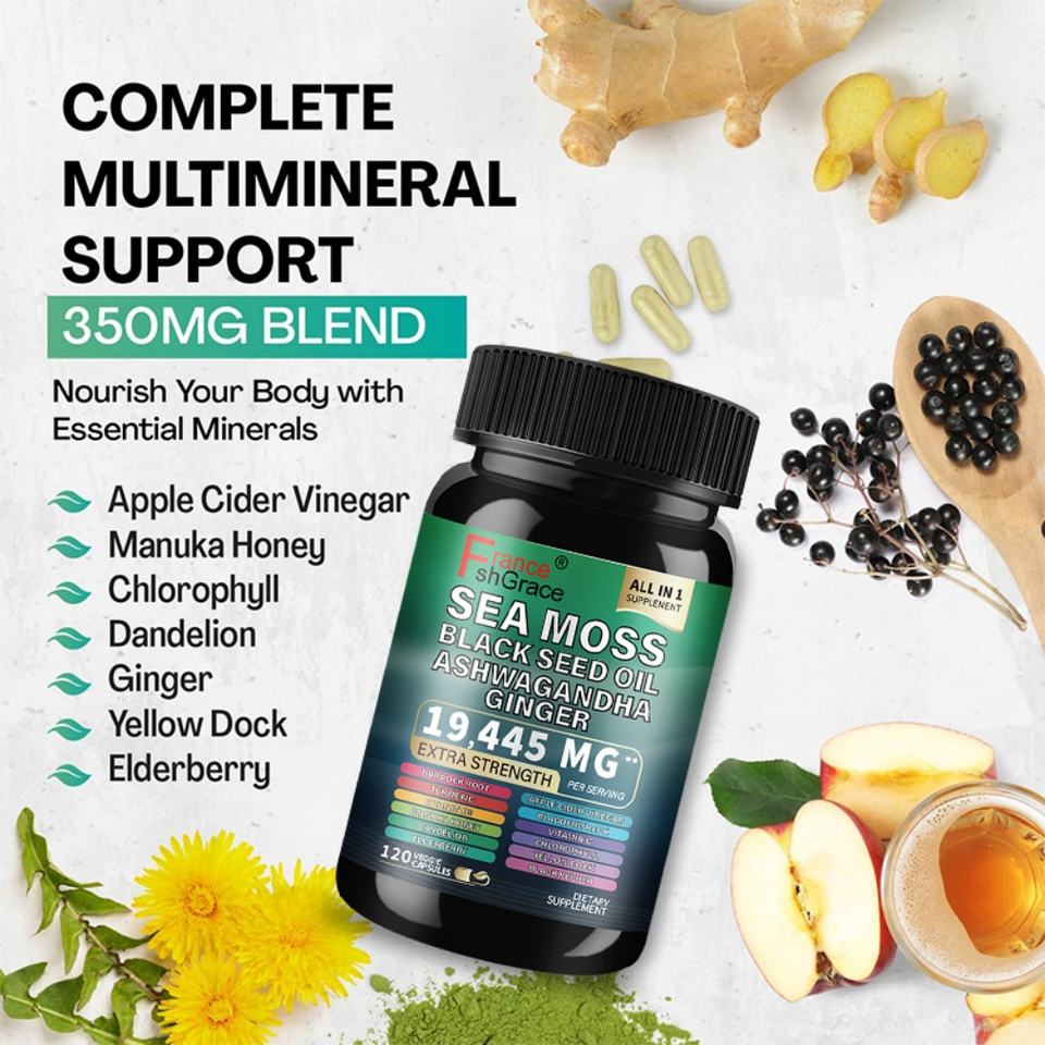 อาหารเสริมสาหร่ายทะเลเข้มข้นสูง 19445 มก. ผสมน้ำมันเมล็ดดำ สำหรับผู้ใหญ่ ช่วยเสริมภูมิคุ้มกัน แคปซูลสาหร่ายทะเล
