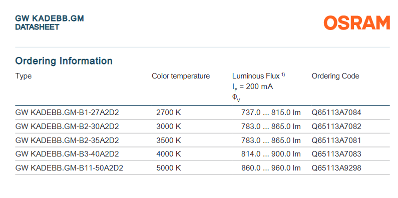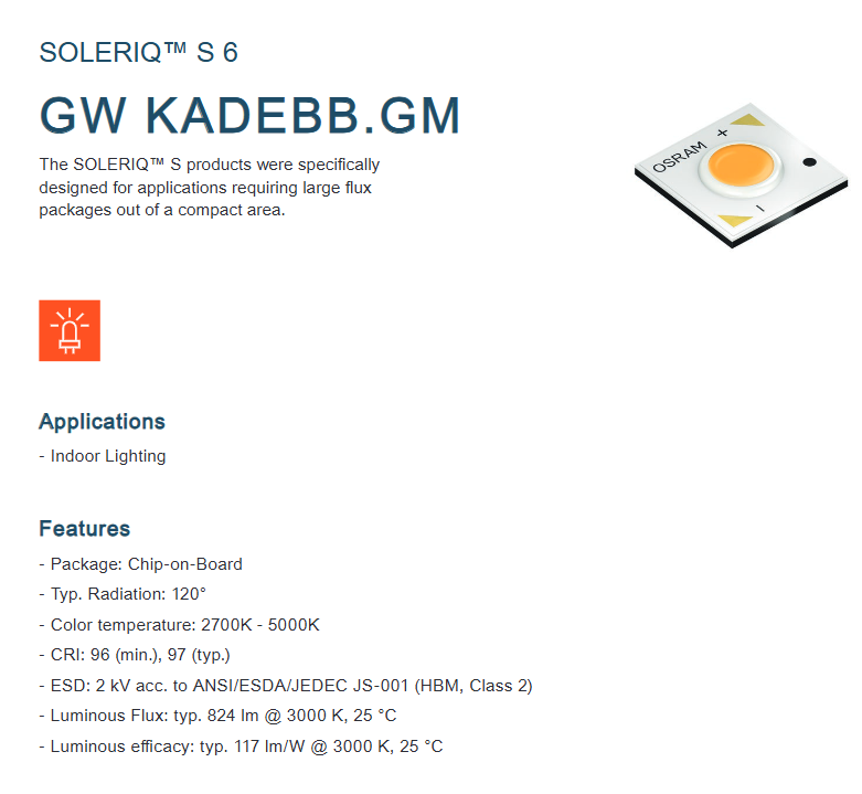 ชิปนำแสง osrams cob 7W KADEBB.GM-B1-27A2D2 CRI96 845LM สีขาวอบอุ่นธรรมชาติสีขาวโทนเย็น