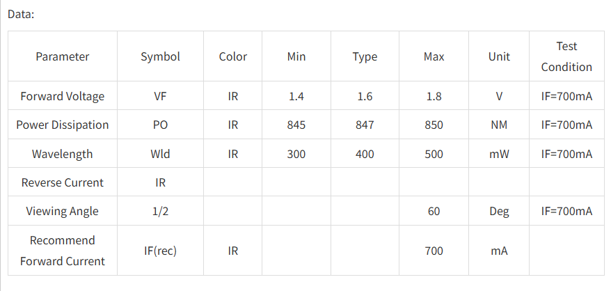 สีเปล่ง:750 นาโนเมตร 810 นาโนเมตร 850 นาโนเมตร 940 นาโนเมตร 1050 นาโนเมตร