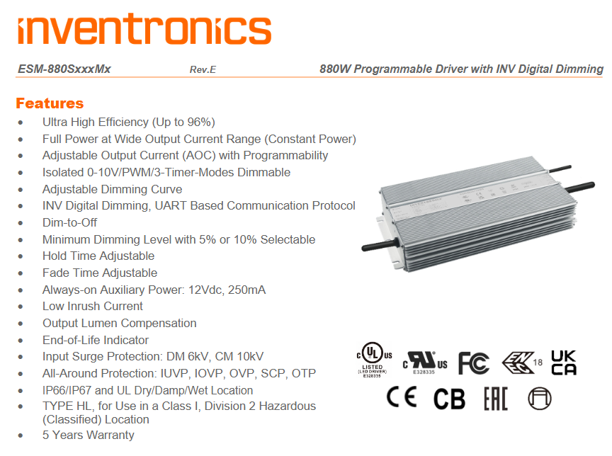 IP66 10KV พลังงานสูง/IP67กันน้ำที่ระบุไว้ /cb/ce ได้รับการรับรองประสิทธิภาพ90-99% 880W ไฟ LED ไดรเวอร์ป้องกันฟ้าผ่า