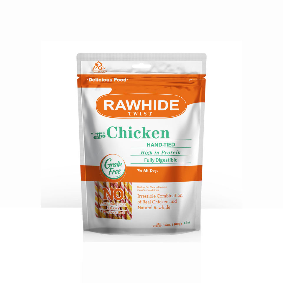 Rawhide chews ขนมที่มีโปรตีนสูง5 "Rawhide Twist ห่อด้วยไก่ช่วยเหลือทำความสะอาดฟันสุนัขเคี้ยวรักษา100กรัม/ถุงสัตว์เลี้ยงอาหารเคี้ยว