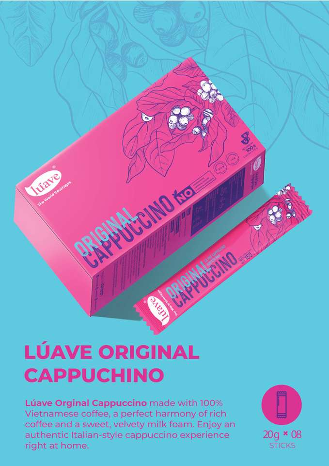 กาแฟคุณภาพสูง 100% กาแฟสำเร็จรูป รสชาติออริจินัล คาปูชิโน่ 20 กรัม x 8 ซอง ผลิตโดยบริษัท ไอเดียส โอเชียน จำกัด (เวียดนาม) รับผลิตแบบ OEM ODM ขายส่ง