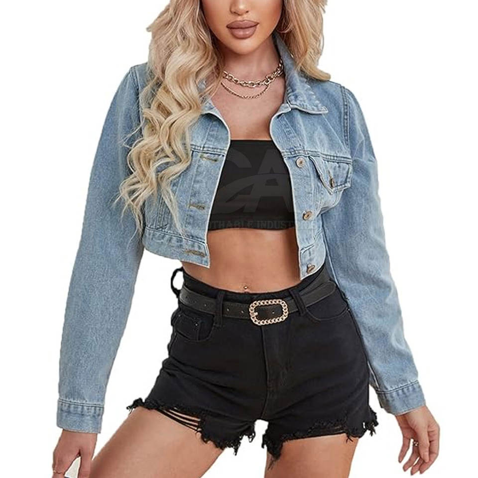 แจ็คเก็ตยีนส์ครอปผ้าฝ้ายคุณภาพสูง 100% ระบายอากาศได้ดีสำหรับผู้หญิง ราคาสมเหตุสมผล ขนาดสั่งทำได้ ผ้าพิมพ์ลาย