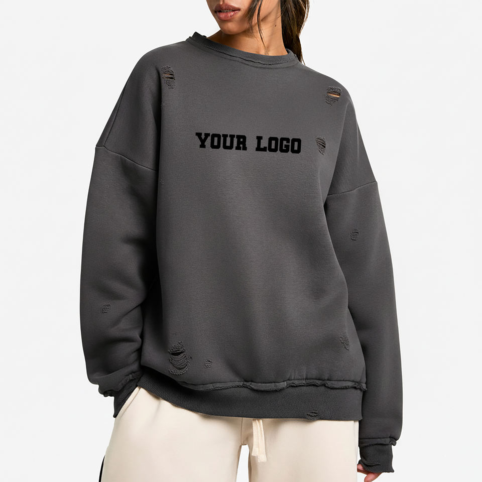เสื้อสเวตเชิ้ตผู้หญิงทรงโอเวอร์ไซส์ ผ้าฟลีซคอตตอน 100% คุณภาพสูง เนื้อหนา ดีไซน์ขาดๆ เท่ห์ๆ ระบายอากาศได้ดี แฟชั่นฮิปฮอป