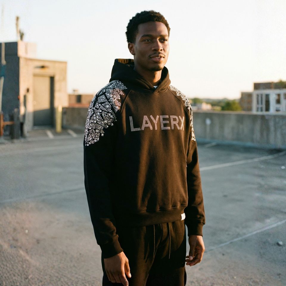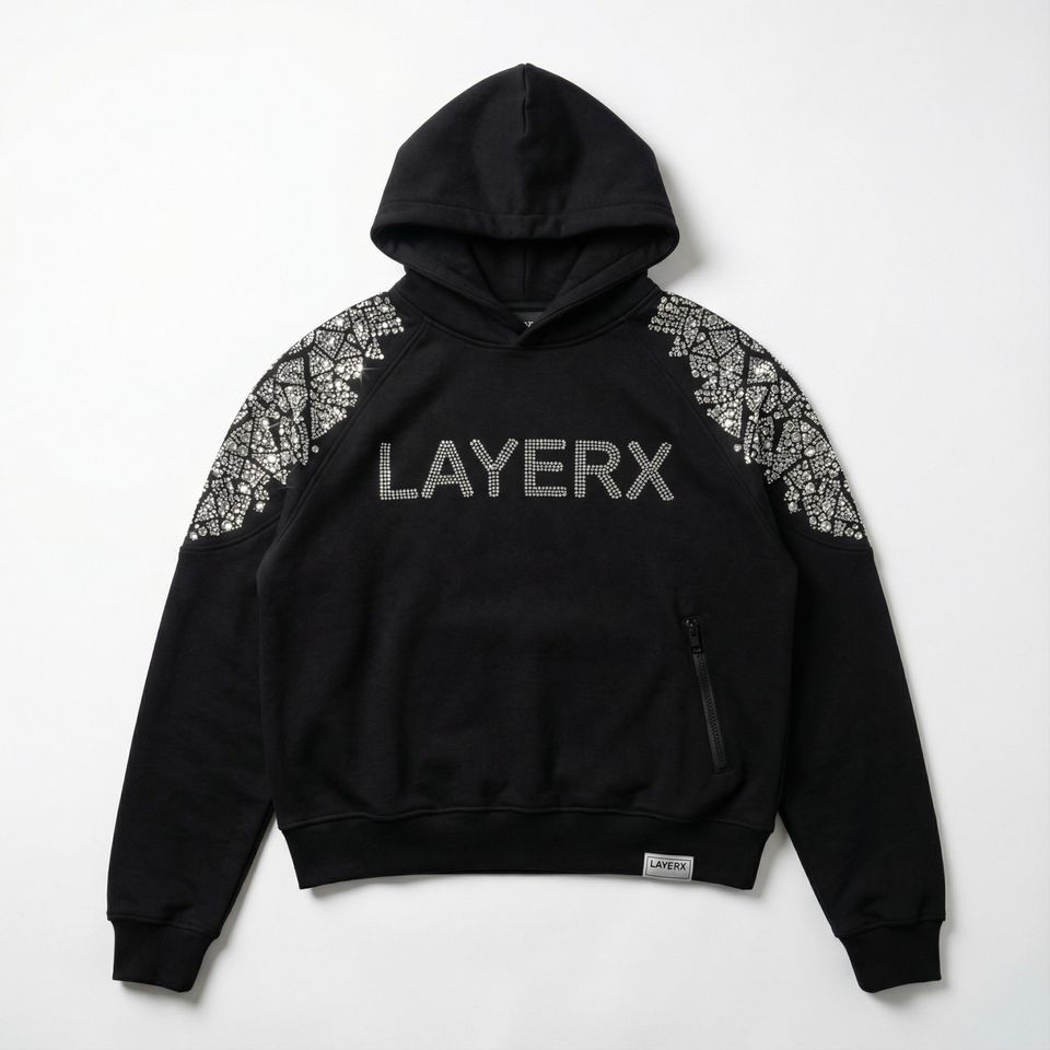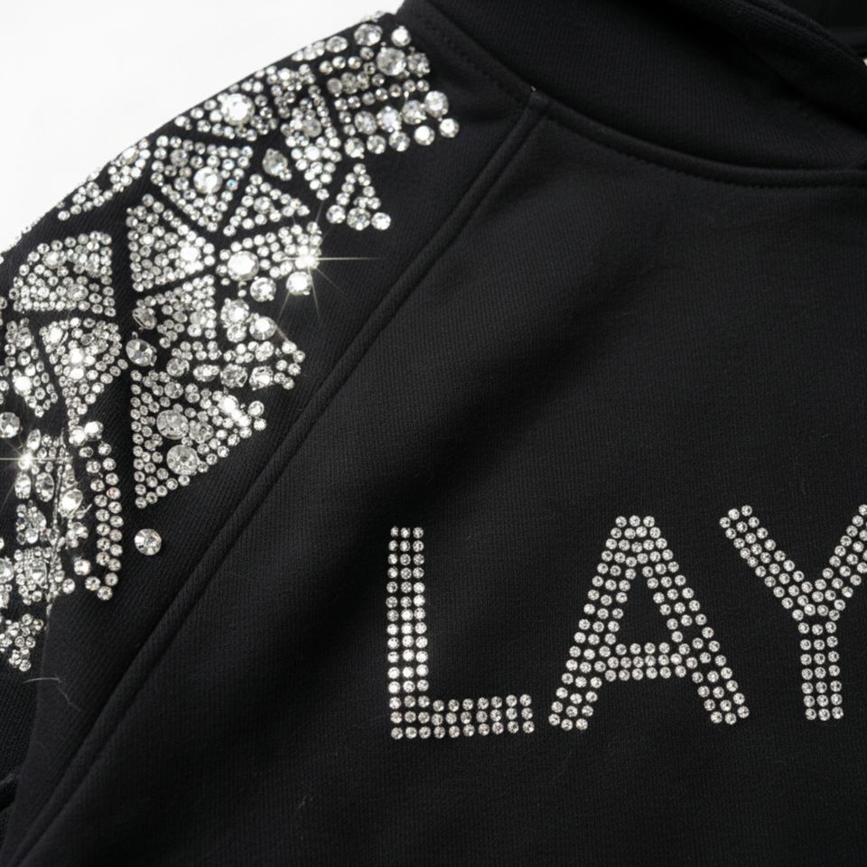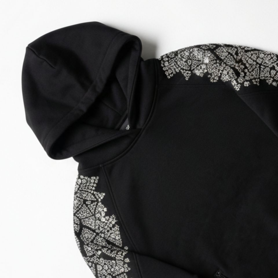 เสื้อฮู้ดดี้ผู้ชายผ้าฟลีซโพลีเอสเตอร์/คอตตอนคุณภาพสูง ปักลายคริสตัล 3 มิติ บนไหล่ น้ำหนัก 350 กรัม สั่งทำโลโก้คริสตัลได้ ทรงปกติ