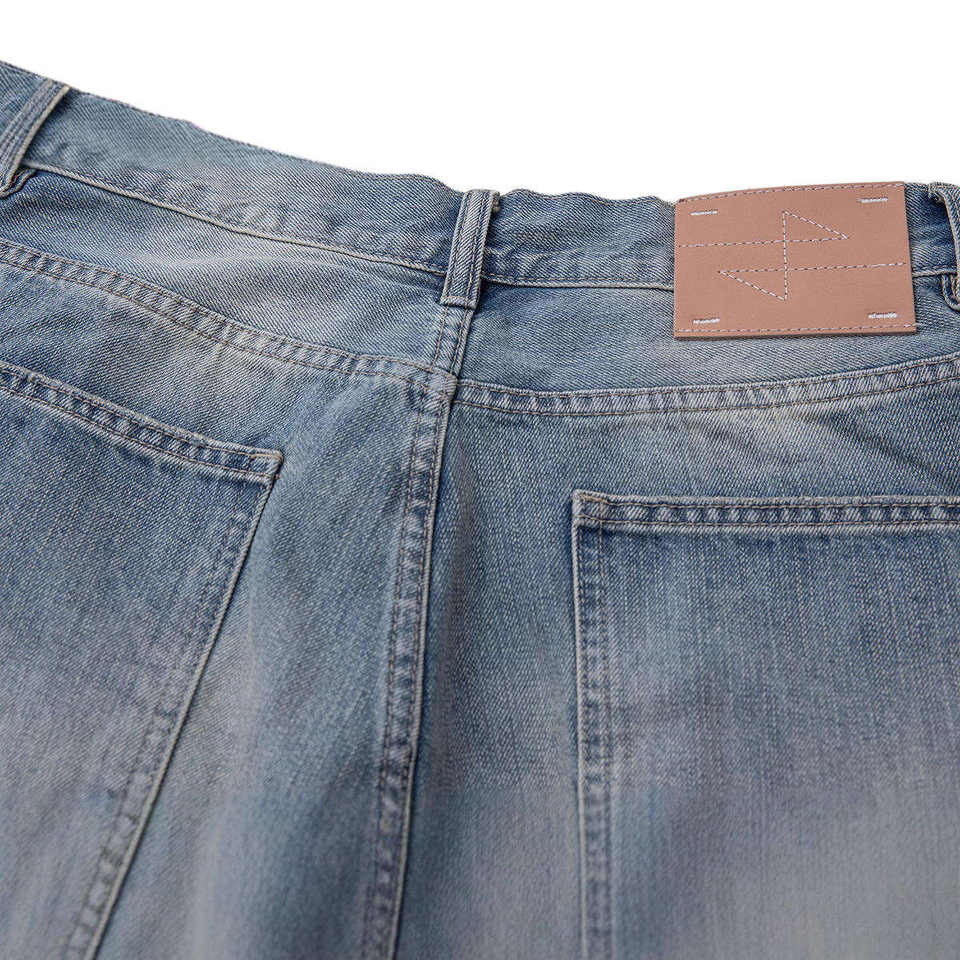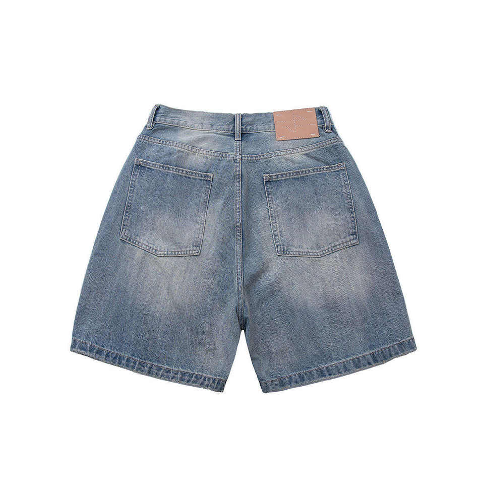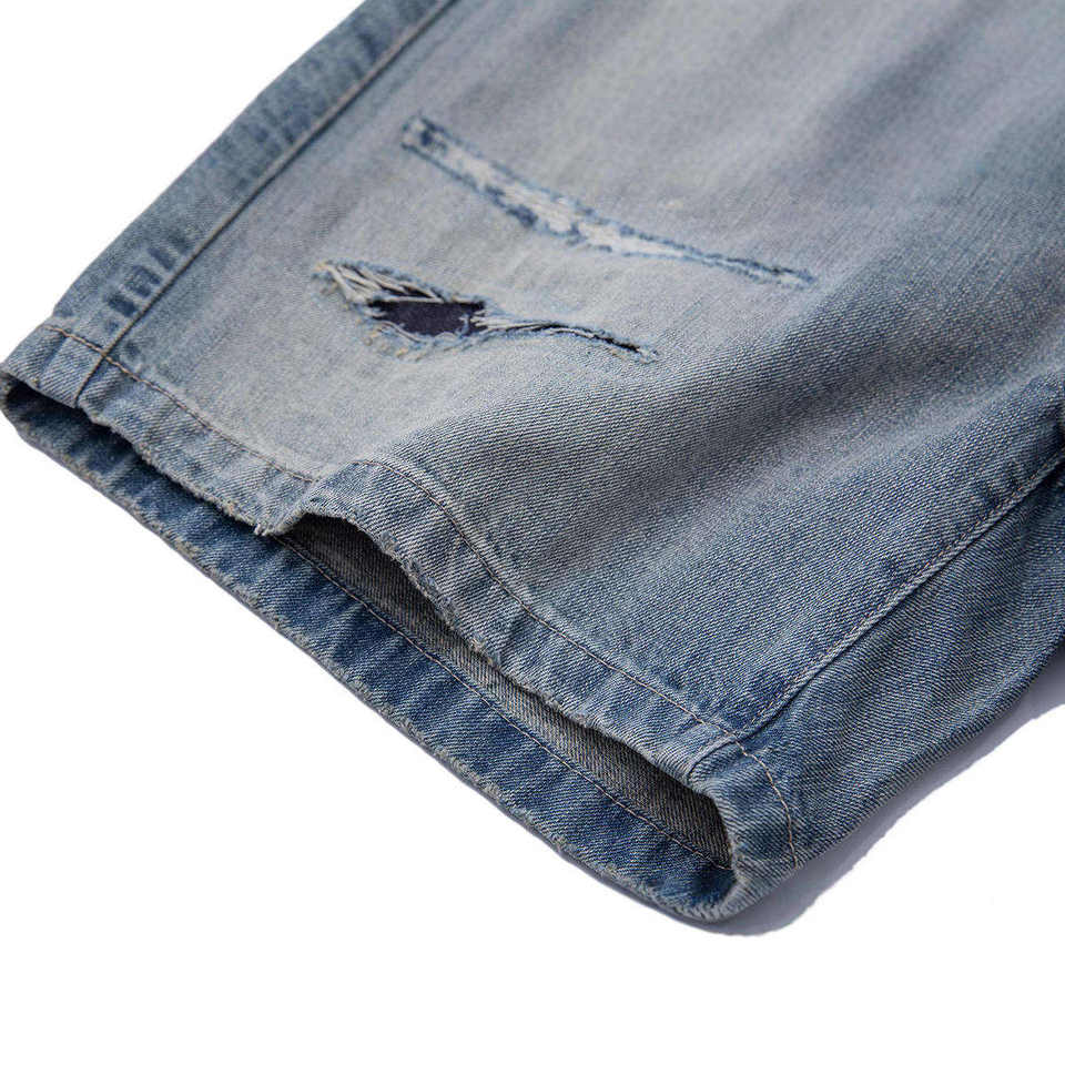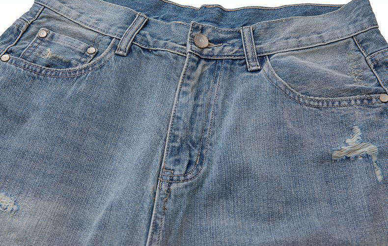 กางเกงขาสั้นผู้ชายผ้าฝ้ายคุณภาพสูง 100% สีฟ้าอ่อน ทรงหลวมแบบ Distressed ขอบดิบ ผ้ายีนส์ฟอกกรด