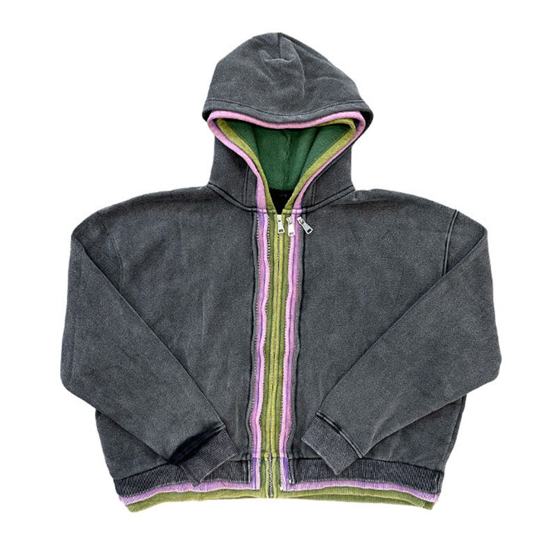 เสื้อฮู้ดผ้าฝ้าย100% สามชั้นวินเทจแอซิดกรดมีซิปทรงโอเวอร์ไซส์เสื้อสเวตเชิ้ตฮิปฮอปแบบลำลอง