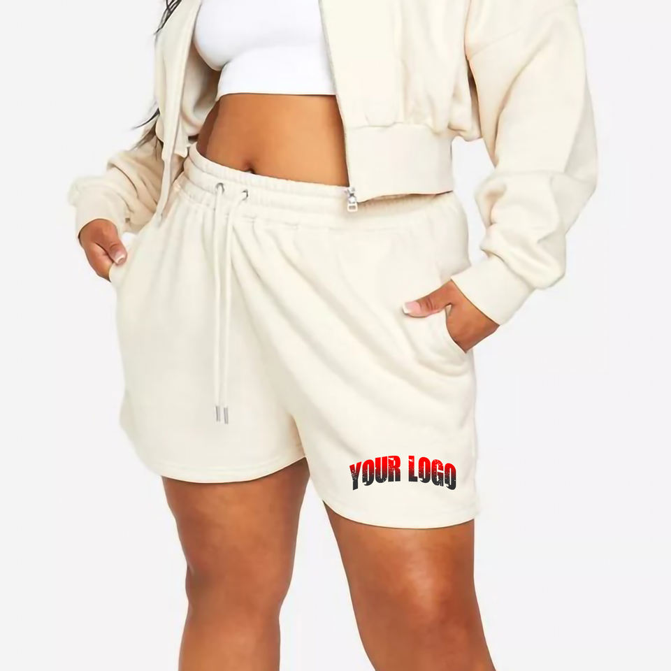 กางเกงขาสั้นผู้หญิงคุณภาพสูง ผ้าฝ้าย 100% พิมพ์โลโก้ด้วยผ้าไหมแบบสั่งทำ ระบายอากาศได้ดี 300gsm เป็นมิตรกับสิ่งแวดล้อม แห้งเร็ว ติดกระดุม แบบเรียบ