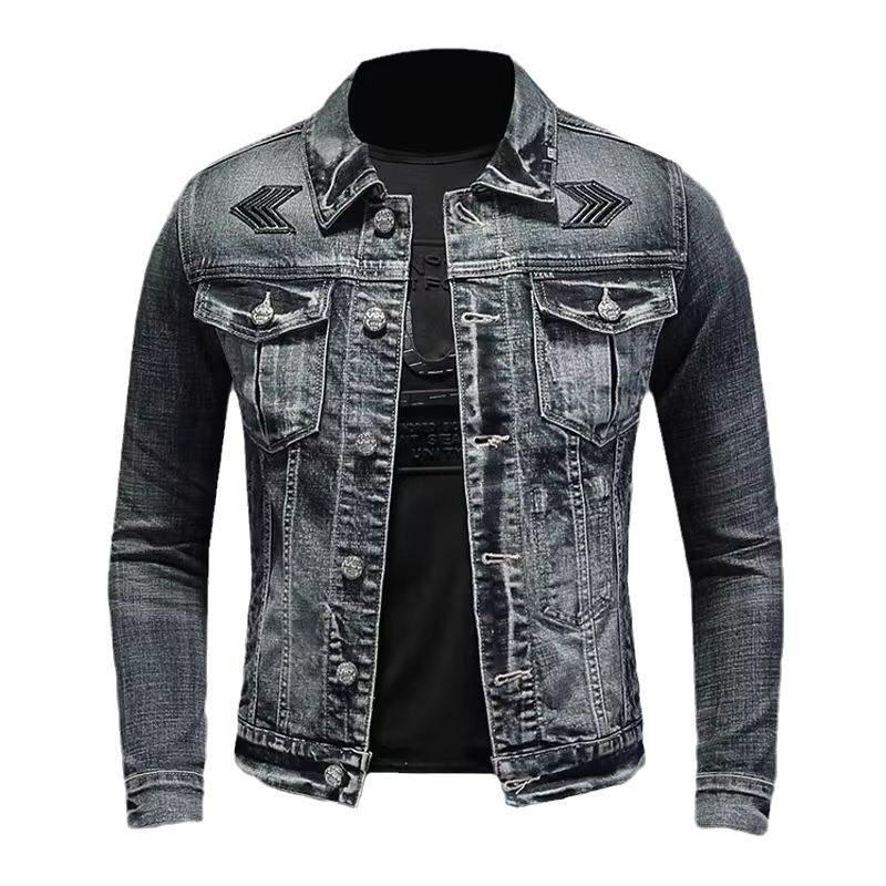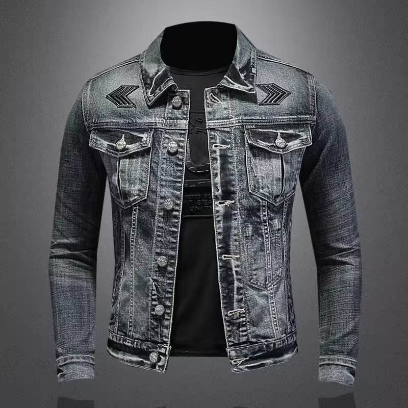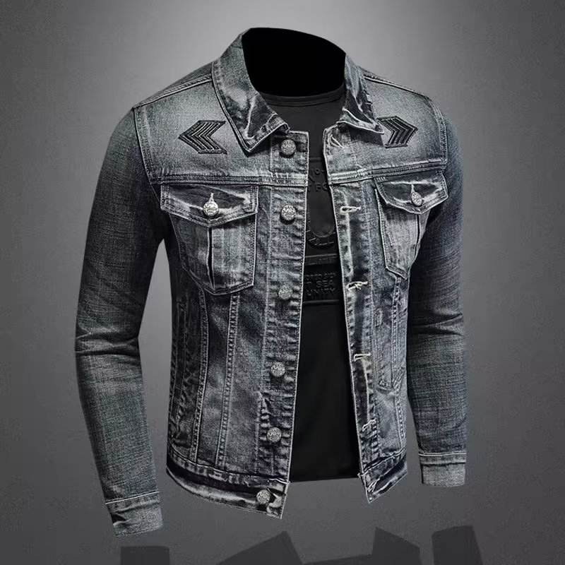แจ็คเก็ตยีนส์ผู้ชายสไตล์เกาหลี ผ้าฝ้ายทอคุณภาพสูง 100% ทรงสลิม ระบายอากาศได้ดี ลวดลายเรียบ สีเดินแบบ ลุคดิสเทรส สโตนวอช เหมาะสำหรับฤดูใบไม้ร่วง