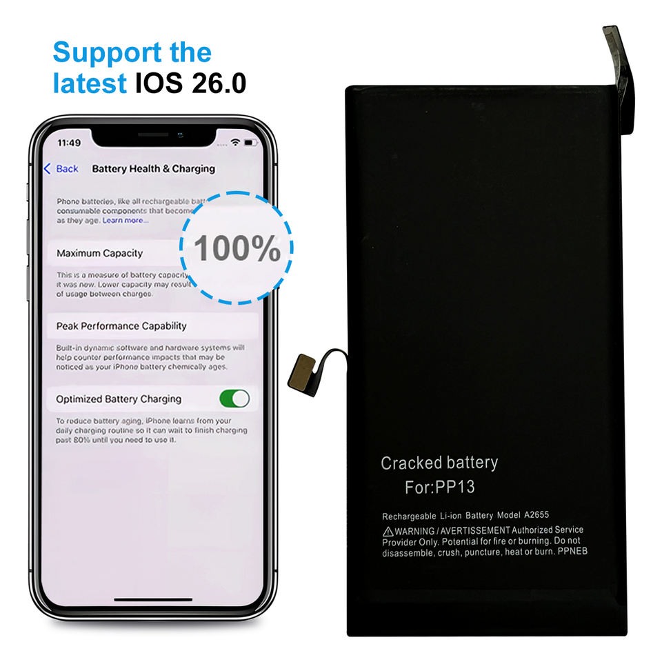 แบตเตอรี่สุขภาพ100% คุณภาพสูงสำหรับ iPhone 13การเปลี่ยนแบตเตอรี่ของแท้ไม่มีการเชื่อมแบบไม่มีป๊อปอัพแก้ชิ้นส่วนที่ไม่รู้จัก