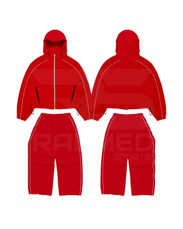 ชุดวอร์มกันลมคุณภาพสูง 100% ไนลอน กางเกงขายาวและเสื้อแจ็คเก็ตมีฮู้ด สกรีนโลโก้ได้ กันน้ำ มีหลายสี สำหรับผู้ชาย