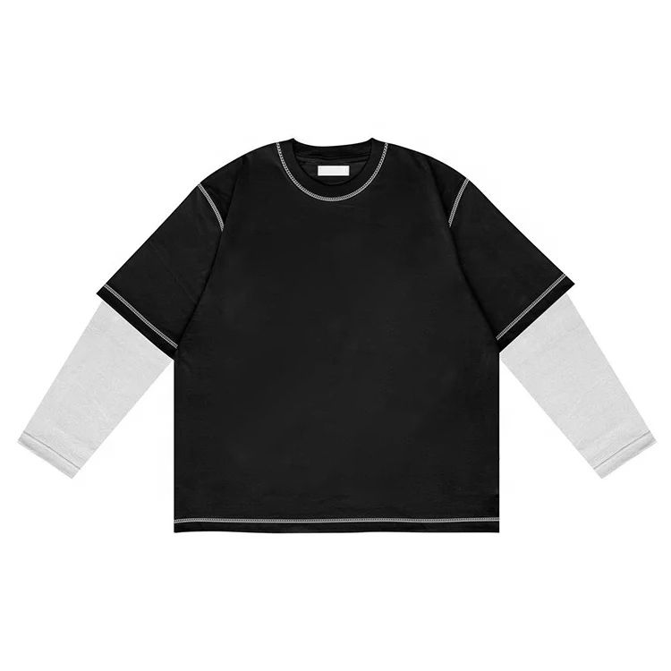เสื้อยืดคอกลมแขนสองชั้นคอตตอนตัดกันเสื้อยืดฮิปฮอปสำหรับผู้ชายเสื้อโอเวอร์ไซส์สำหรับฝึกซ้อมผ้าคอตตอน100%