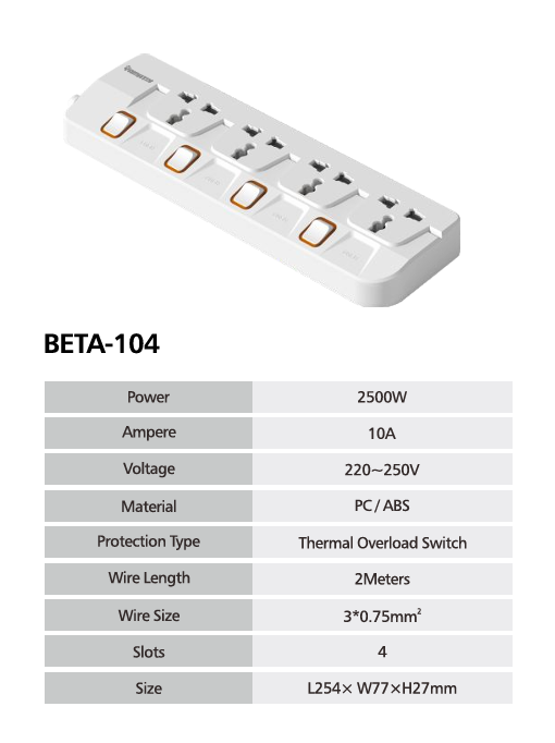 ปลั๊กพ่วงคุณภาพสูง 10A 5 เมตร แกนทองแดง ABS รุ่น BETA 4 ช่องเสียบ พร้อมไฟ LED ป้องกันไฟเกิน สำหรับบ้านและสำนักงาน