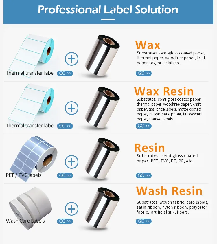 ริบบิ้นถ่ายโอนความร้อนคุณภาพสูง 110 มม.*300 ม. สีเต็มรูปแบบ พรีเมียม วัสดุแว็กซ์ ใช้ได้กับเครื่องพิมพ์บาร์โค้ด ราคาโรงงาน