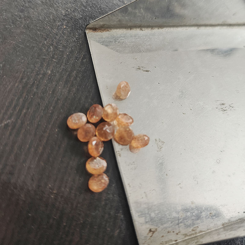 พลอยซันสโตนธรรมชาติทรงกลมเจียระไนแบบบริลเลียนท์คุณภาพสูง ขนาด 5 มม. จำนวน 12 ชิ้น น้ำหนักรวม 4.85 กะรัต สีส้ม ราคา US$3.88 จาก Iroc Sales